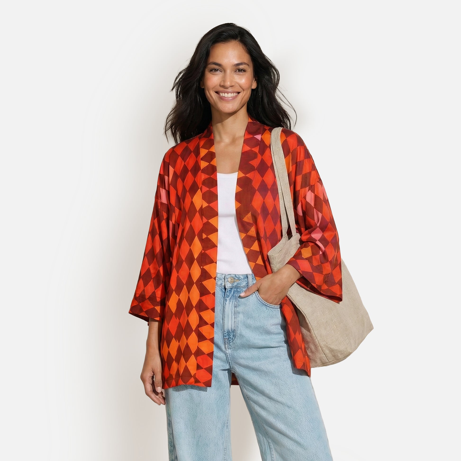 Confeccionado en viscosa EcoVero™ suave y sostenible, esta blusa o kimono luce un exclusivo estampado de rombos diseñado por Kristina Nordlöf. Cada kimono es único: no hay dos piezas exactamente iguales; la parte delantera y trasera siempre son diferentes gracias a su diseño irregular en cálidos tonos rojo, rosa, naranja y terracota.
