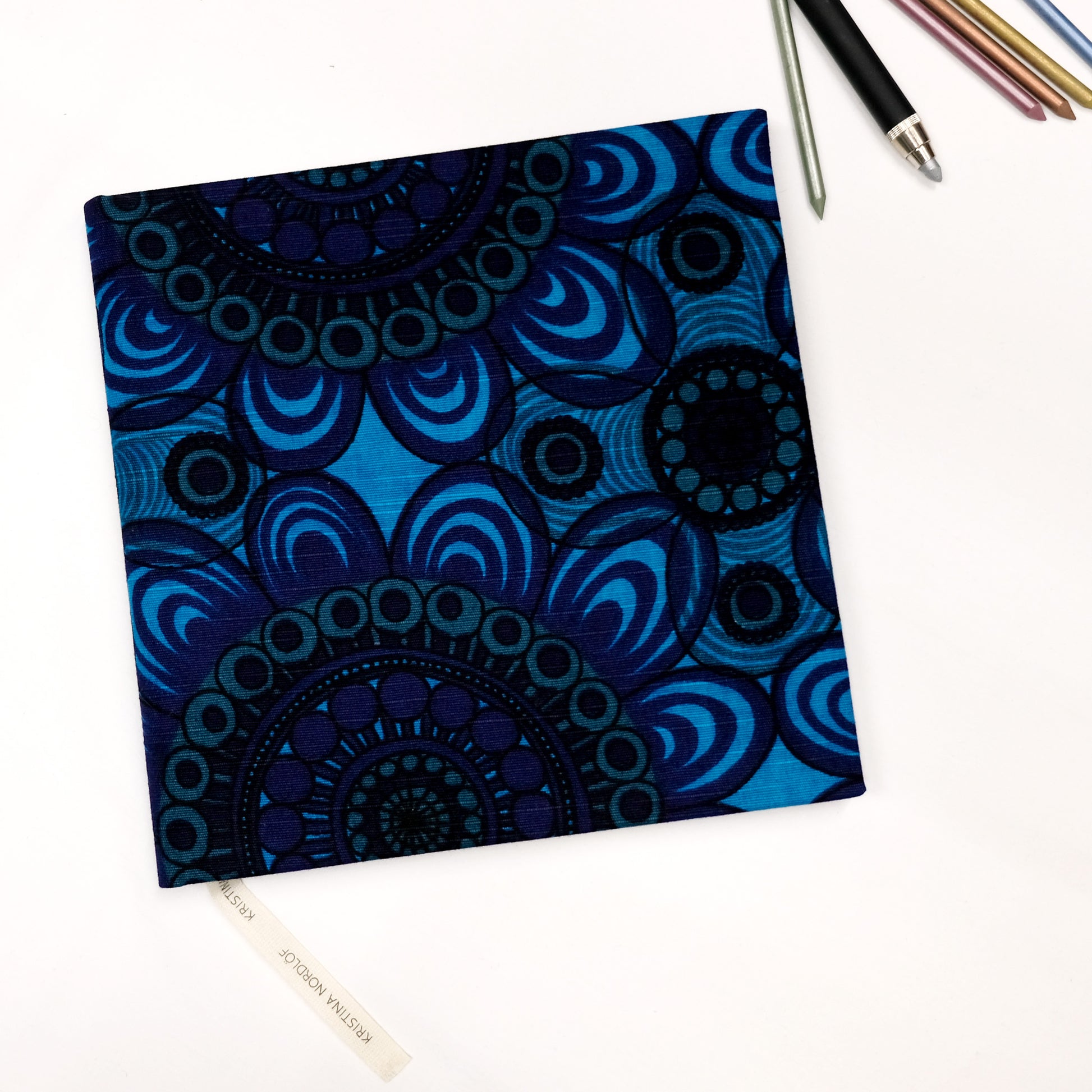 Kristina Nordlöf Journals/Sketchbooks are handbound with a sturdy, printed cotton or linen fabric cover. It’s either a Kristina Nordlöf original design or a Scandinavian vintage fabric from her personal collection.