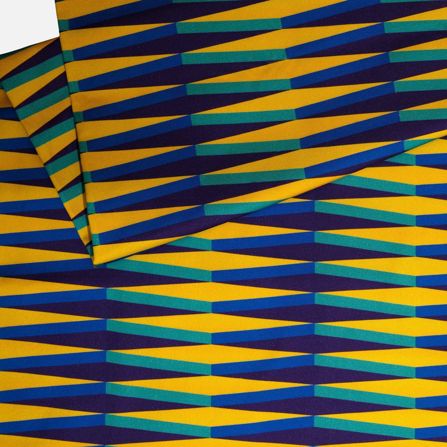 Printed, soft, sustainable cotton tablecloth (140 x 240 cm). The expressive, geometric pattern in saffron yellow, purple, blue, and olive green will bring a bold graphic look to your home, without a doubt.